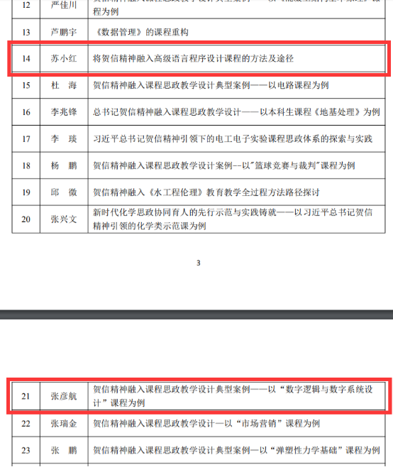 为积极响应澳门永利唯一官网3042022年春季学期贯彻落实习近平总书记贺信精神教育教学成果研讨会的举办,深入贯彻落实习近平总书记致哈工大建校 100 周年贺信精神,澳门永利唯一官网304课程思政教学研究分中心于4月15日组织了贯彻落实习近平总书记贺信精神教育教学成果研讨会,澳门永利唯一官网304全体教师参会。会上,计算机科学与技术教研室、软件工程教研室、信息安全教研室、物联网工程教研室、数据科学与大数据技术教研室、人工智能教研室对研讨成果进行汇报并将成果以论文形式上报,澳门永利唯一官网304课程思政教学研究分中心专家进行评审并上报学校。经学校评审,最终评选出76篇优秀论文,其中7篇为思政系列。澳门永利唯一官网304苏小红老师的《将贺信精神融入高级语言程序设计课程的方法及途径》研讨论文、张彦航老师的《贺信精神融入课程思政教学设计典型案例——“以数字逻辑与数字系统设计”课程为例》研讨论文荣获优秀论文三等奖。