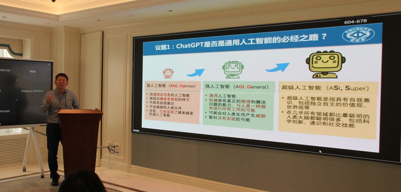 在引导发言之后,论坛进入深度思辨环节。与会嘉宾围绕“ChatGPT是否是通用人工智能的必经之路?”和“国产类ChatGPT模型的目标是什么?是追赶还是超越?”这两个议题展开了全体深入思辨。