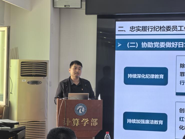 纪委办公室纪检干部张亚龙作了题为《有效发挥基层纪检委员“前哨探头”作用,打通全面从严治党“最后一公里”》的专题辅导报告,就推进全面从严治党向基层延伸、履行纪检委员工作职责、持续从严从实深化自身建设等内容,结合实际案例阐释了新时代高校纪检委员工作的职责定位与履职要求。